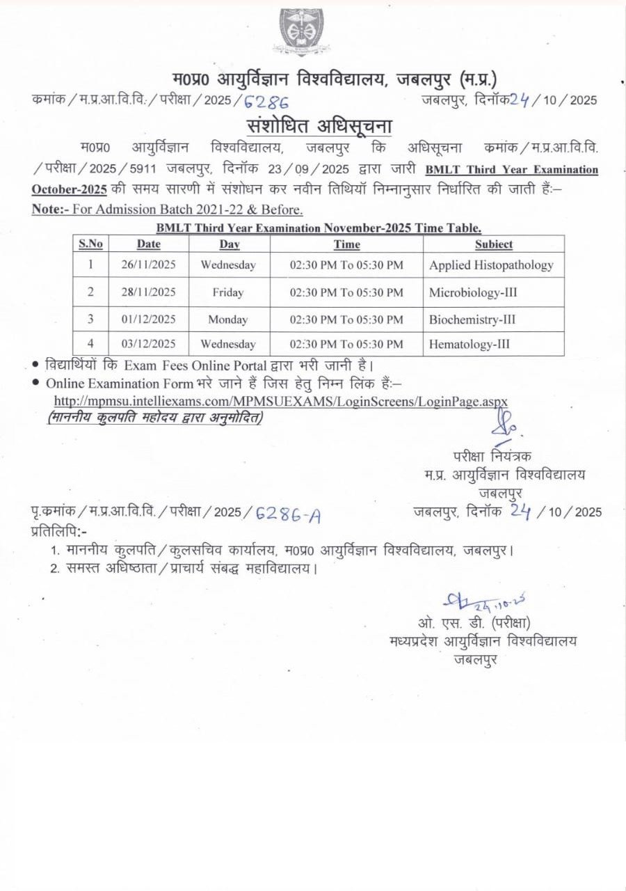 Notification Regarding BMLT 3rd Year Examination 2025 Time Table.